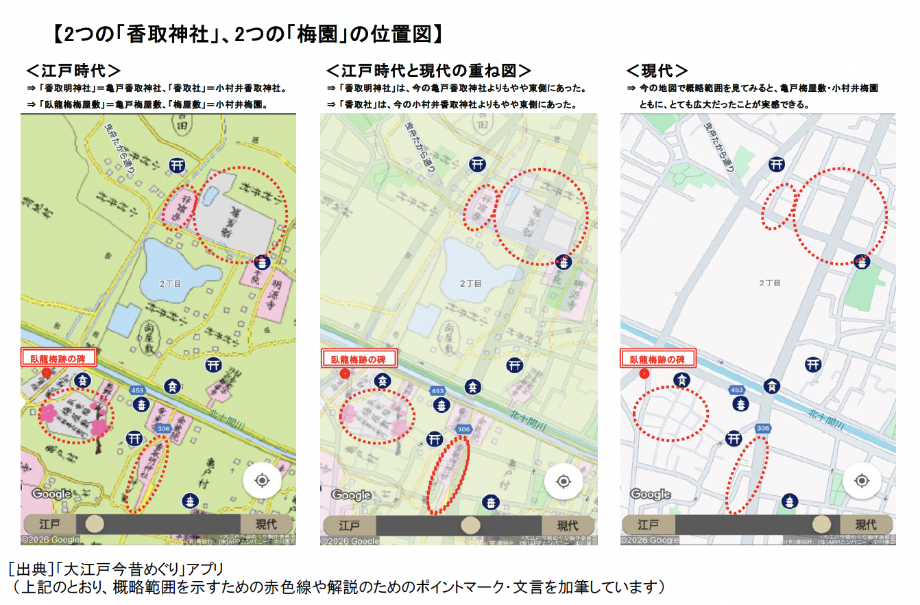 上の図は、【第35回】でもご案内した「大江戸今昔めぐり」アプリによるもの。古地図と現在の地図を重ね合わせるように対比できて、便利です。こうして見てみると、亀戸梅屋敷・小村井梅園ともに、とても広大だったことが改めて実感できますね。