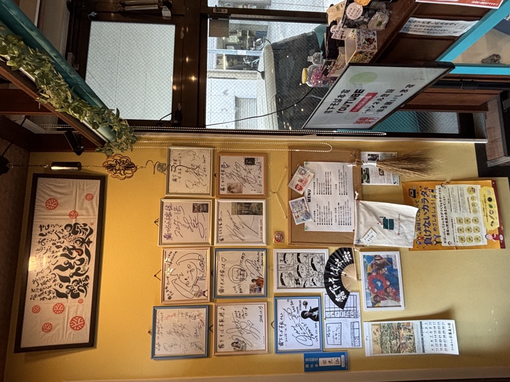 ▲会社事務所を兼ねた1階で、乾麺・冷凍生蕎麦・そば粉・そばつゆ等の自社製品を直売しています。壁面には、こちらを訪れた有名人たちのサイン色紙が飾られていました。