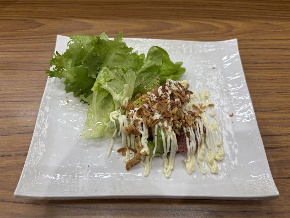 ▲まずは、「生ビール・中」(650円)で今日のさんぽにお疲れさま! お通しに続いて、つまみに「アボカドまぐろ合え」(500円)を。洋風仕立てで舌になじむ食感です。