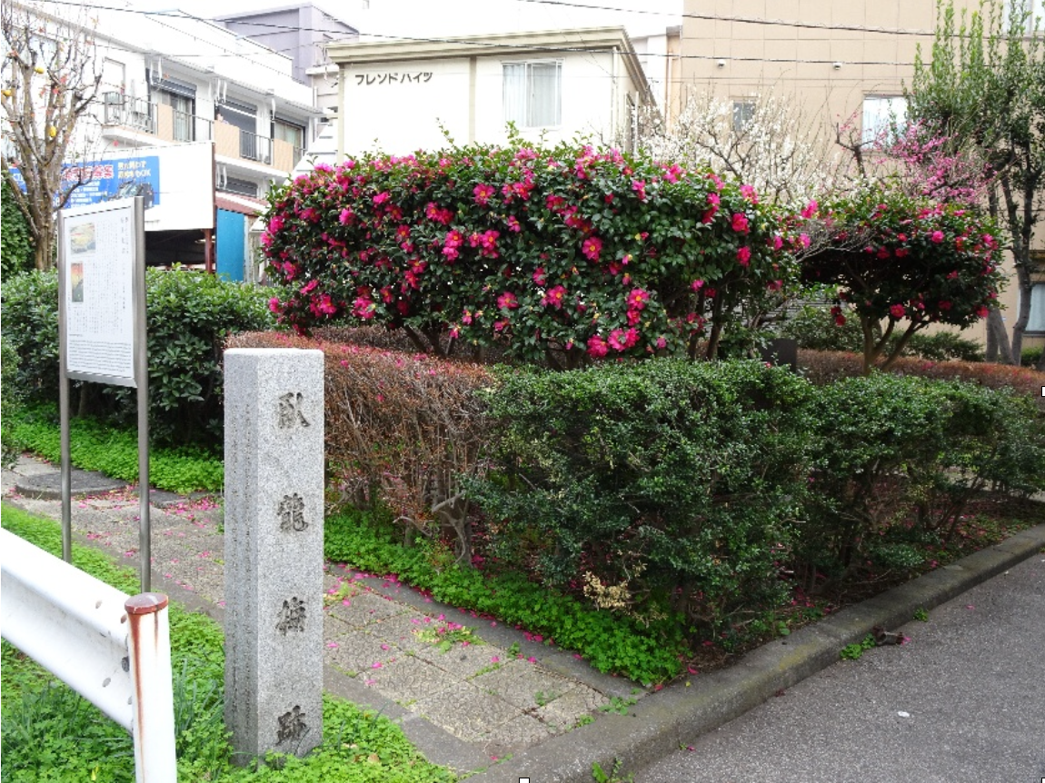 ▲住宅街の一角、小さなポケットパークの中に「臥龍梅跡」の碑が。写真では椿の花が大勢力ですが、その上部に白梅と紅梅の姿も見えます(撮影時期1月下旬)。