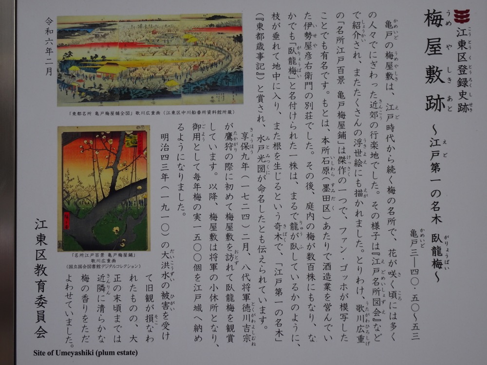 ▲境内にある解説板。こちらも、かつては墨東有数の梅名所でした。文章中央辺りの「築山」はどんなものだったのか。解説板の文章の左側に掲示された浮世絵を見てみましょう。