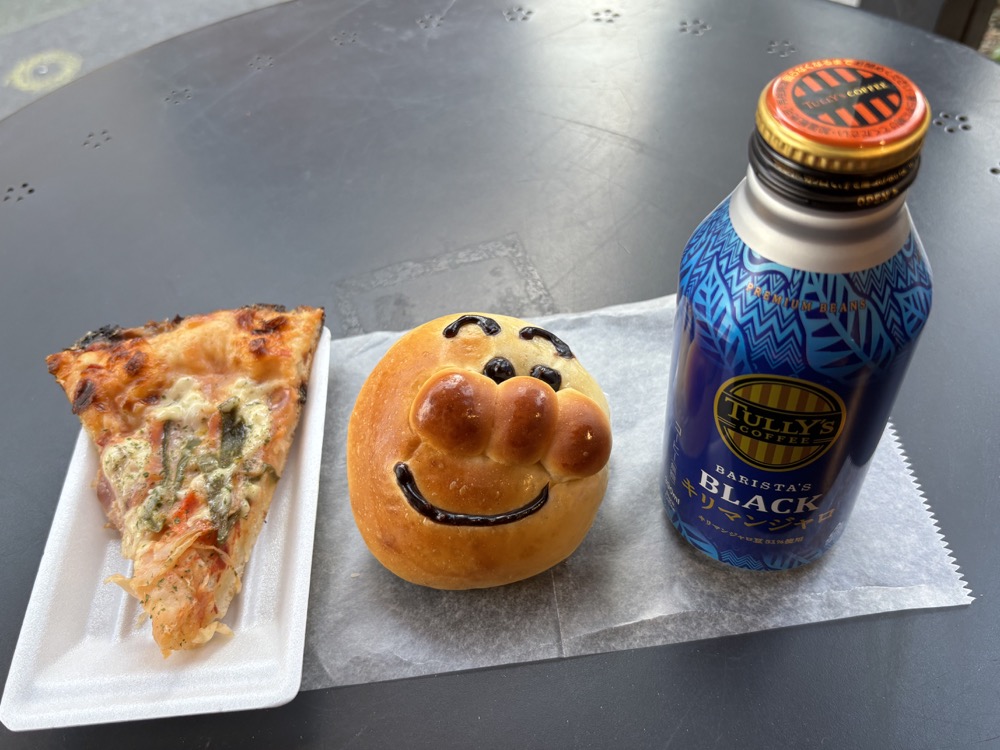 ▲左側から「石窯ピザ」「正義の味方あんぱん」「缶入りコーヒー」(3点合計659円)。あんぱんは、例のキャラクターがモチーフになっているよう。(悪党にノックアウトされたのか)目が××になっているバージョンも販売されています。上の写真のテラス席でいただきました。