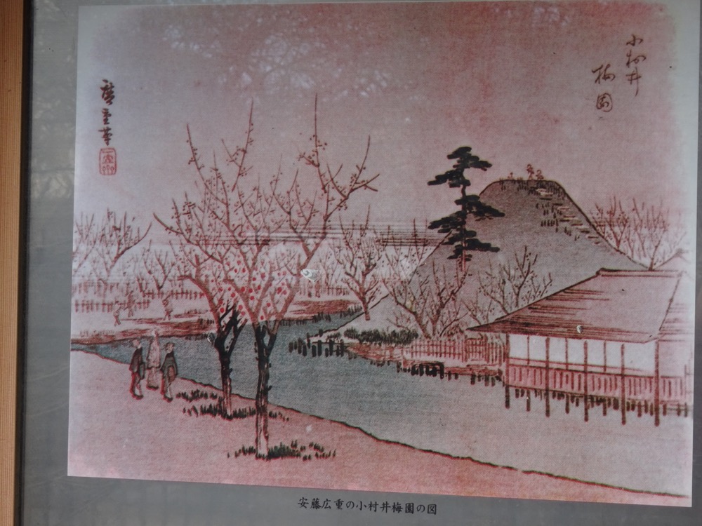 ▲歌川(安藤)広重筆「小村井梅園」。「築山」が富士山形の小高い丘だったことが分かります。次の浮世絵は、その〝山頂〟からの様子です。