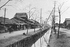 ▲明治末期(1910年)の南割下水の様子(出典:ミツカン水の文化センター機関誌『水の文化』57号。元出典は、墨田区立ひきふね図書館蔵と記載)。広い道路を分割するように流れるため、「割」の字があてられたようです。