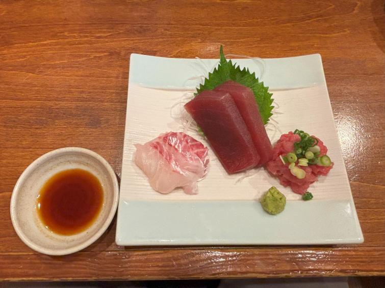 ▲つまみは、まずは「特選刺身三点盛」(1,200円)を。厚切りのマグロが存在感大です。