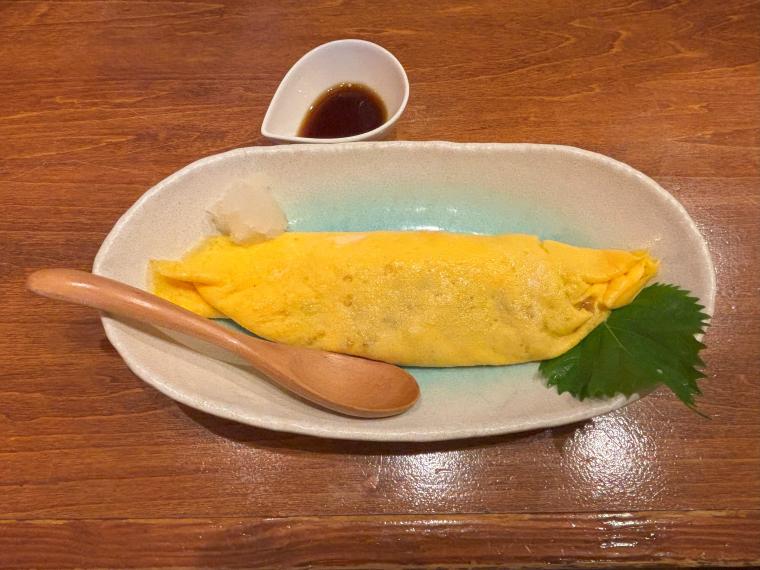 ▲「納豆オムレツ」(600円)は、細身で食べやすい形状。大根おろしとポン酢が添えられて、中身の大粒の納豆との相性も抜群な〝和風テイスト〟でした。