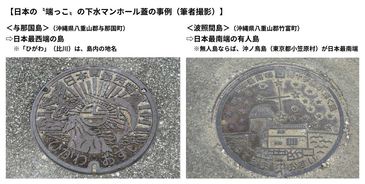 1980 年代頃から、全国の市町村がそれぞれ独自デザインのマンホール蓋を設置し始めたようです。地域の特徴やアピールポイントなどを意匠に反映したもの。例えば、日本の〝端っこ〟のマンホール蓋は、このようなものです(2025年3月撮影)。