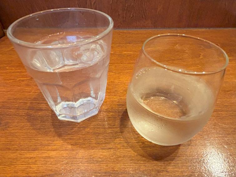 ▲次のお酒は、会津の日本酒「写楽」(右、650円)。日本酒にはチェイサーの水(左側のグラス)をさりげなく添えて出してくれるのが、嬉しい気配りです。
