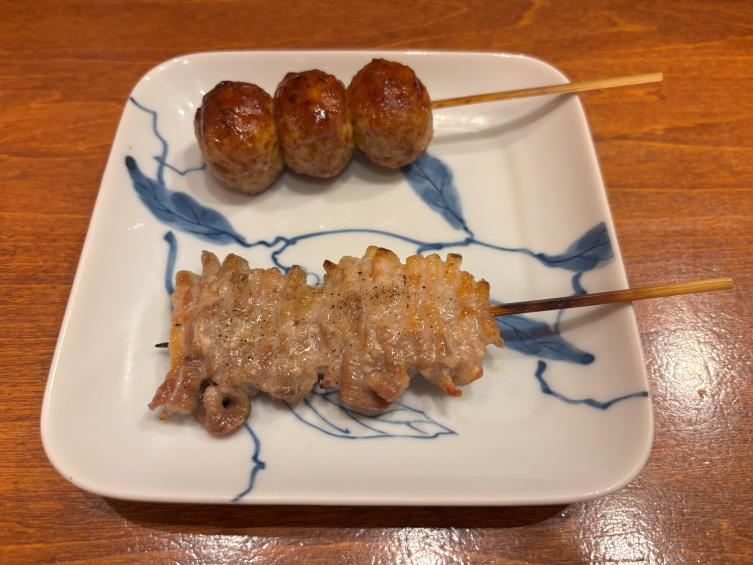 ▲串焼きのラインアップも充実しています。2本以上のオーダーがルールで、異なる組み合わせもオーケー。「つくね・タレ」(上、250円)と「豚バラ・塩」(下、300円)を3杯目のお酒「チューハイ」(450円)と一緒に楽しみました。