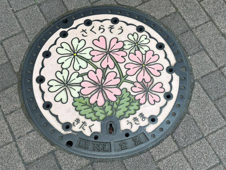 実は、永井荷風さんにもゆかりのあるデザインマンホール蓋「浮間桜草」が、JR浮間舟渡駅近くの北区内にあります。