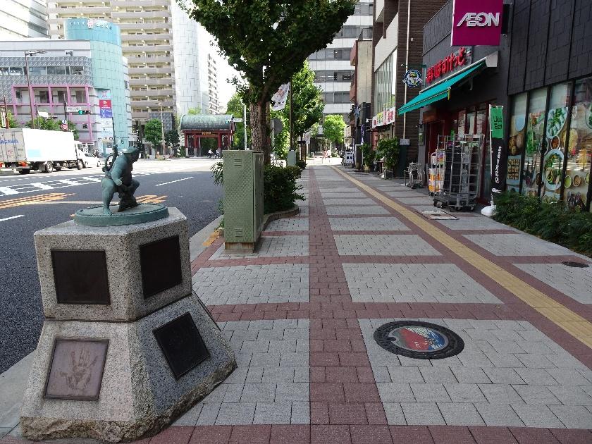 ▲サイト上の説明に記された「相撲像」、実は国技館通りの両側歩道沿いに複数設置されています。この遠景写真を目印にすると見つけやすいかも。