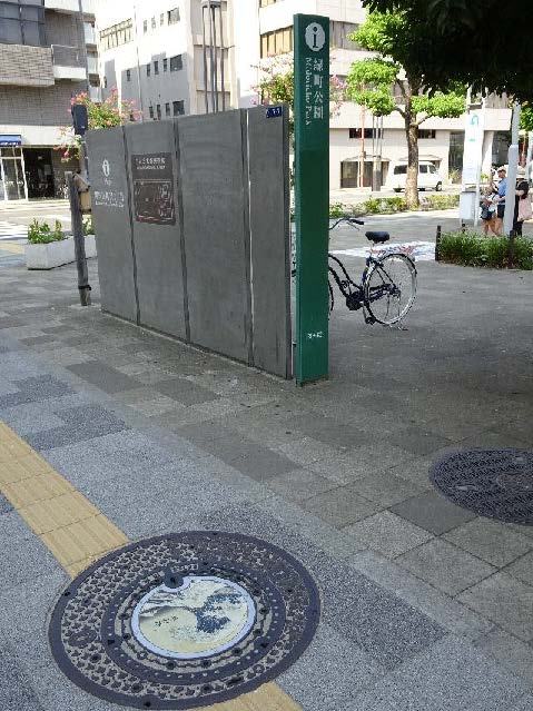 リフリッシュできたので、さんぽを続けます。広大な錦糸公園の北側にある複合商業等施設「オリナス」。その南西端の歩道の一角に、4つ目のマンホール蓋を発見しました。