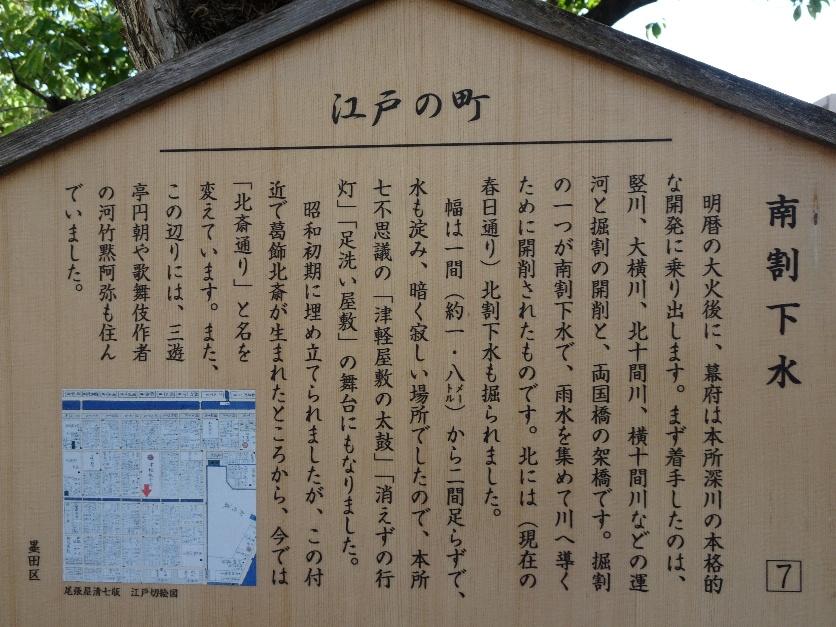 北斎が生まれた地は、緑町公園の周辺。公園内には「葛飾北斎生誕地」ほかいろいろな解説板が掲出されています。その中に、こんな1枚もありました。
