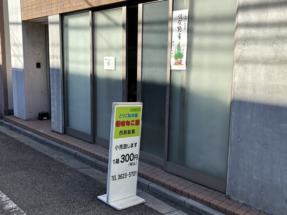 錦糸公園の南側のエリアには、今でも製造を続けているところが数軒あります。まずは、きなこ棒(「棒きなこ当」)を作る「西島製菓」を訪ねてみましょう。