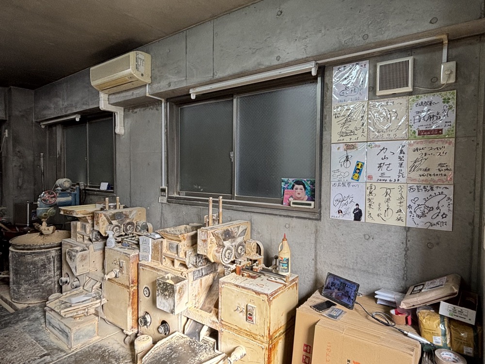 ▲工場の一角を撮影させていただきました。主原料の1つ、きなこの〝粉感〟が各機器周りにも見られます。写真右側の壁面には、こちらを訪れた有名人たちのサイン色紙が飾られていました。