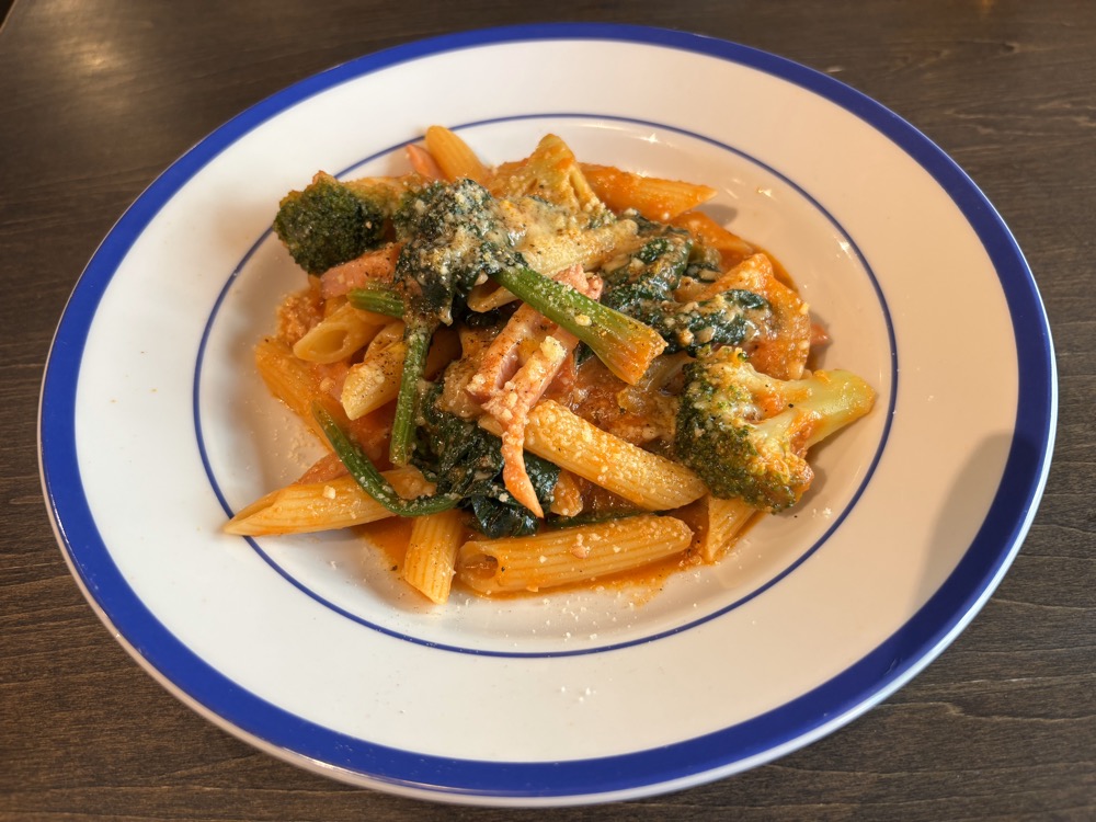 ▲イタリアン2品の1つ「ペンネ(ベーコンと季節野菜)」(1,400円)をオーダー。当日の季節野菜、ブロッコリーとちぢみほうれん草は、トマトソースとの相性がぴったり。白ワイングラス(フランス・ロレーヌ産、900円)を追加し、前菜ともどもおいしくいただきました。