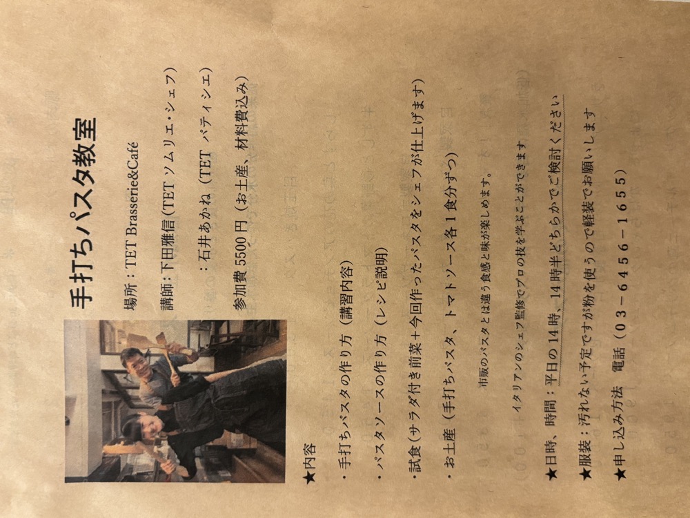 ▲店内の一角に貼られていた案内書。イタリアン系主体のお店らしく、手打ちパスタづくりを体験できるようです。