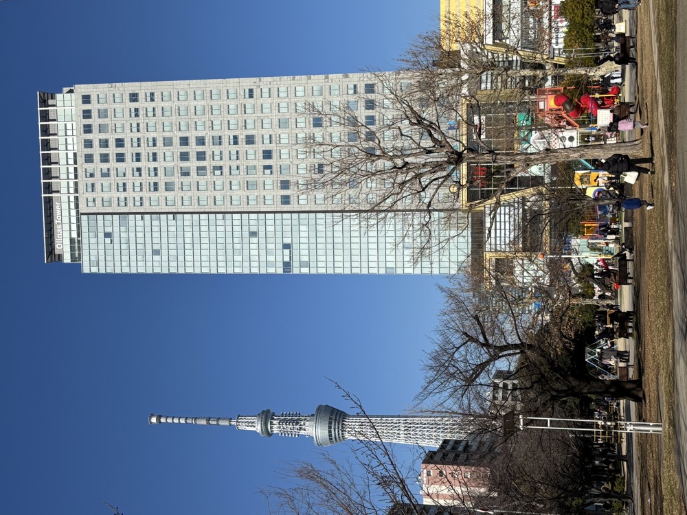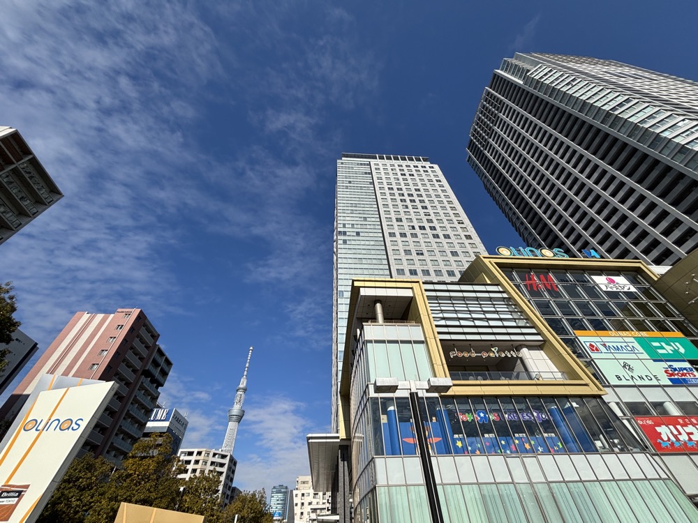 ▲錦糸公園の北側には、オリナス錦糸町のオフィスビルや足元の商業施設の姿が。その左側には、東京スカイツリーが青空にくっきりと見えました。かつての陸軍糧秣廠は、錦糸公園の場所を中心として、周辺エリアにも倉庫群が点在していたようです。