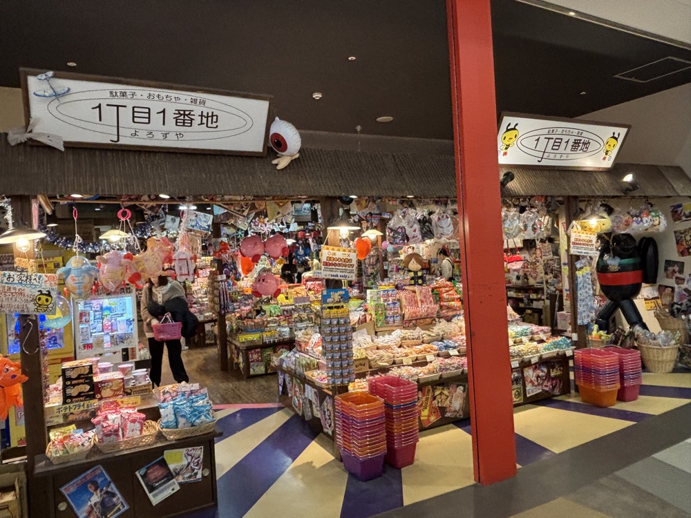 オリナスモールの3階にあるのが「1丁目1番地」。全国あちこちの大型ショッピングモール内に出店しているチェーンです。昭和30年代の駄菓子屋をイメージした装飾で、懐かしい駄菓子や玩具等を販売しています。