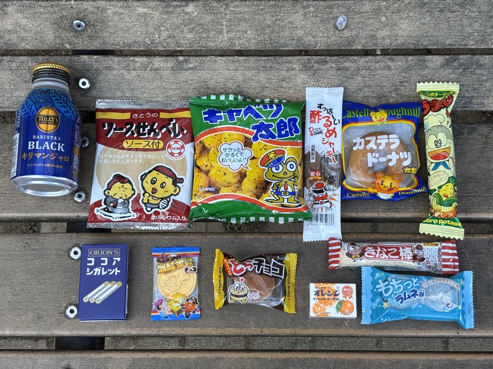 ▲近くのコンビニで買った飲み物とともに、先ほど買った駄菓子を公園のベンチに並べてみました。素材も味もさまざまなラインアップ、実に11個! どれから食べるか、目移りしてしまいます。(ちなみに、11個全部のお値段360円足らずでした)